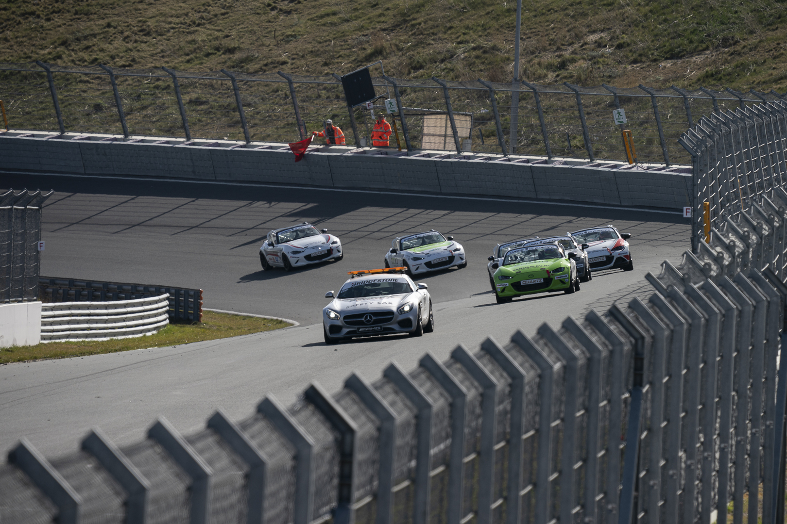 Vanochtend waren we getuige van één van de fraaiste Mazda MX-5 Cup races van de afgelopen jaren. Niels Langeveld, gestart vanaf een tiende plaats, reed in de laatste ronde en in de laatste bocht nog vooraan. In de laatste meters kwam achtervolger Dominique Kraan uit zijn slipstream en wist met een minimale voorsprong van 0.018 seconde de wedstrijd op zijn naam te schrijven. Vanmiddag gaan er 21 wagens van start in de volgorde van de kwalificatie tijden van gisteren. Niels Langeveld start vanaf de poleposition, met Marcel Dekker naast hem op de eerste rij. De tweede startplaats wordt gevormd door Filip Wojtowicz en de winnaar van vanochtend Dominique Kraan. Pim van Riet start weer als laatste omdat hij door technische problemen niet kon meedoen aan de kwalificatie. Met een nieuwe wagen reed hij vanochtend van de 21ste plaats naar een fraaie zevende positie. Benieuwd hoe de routinier vanmiddag gaat eindigen.