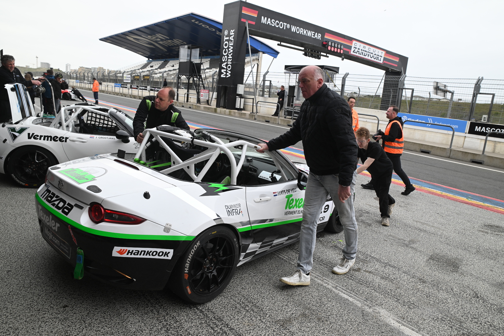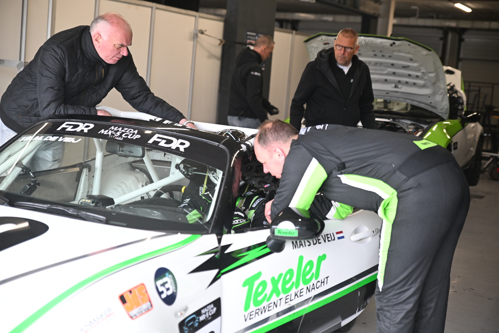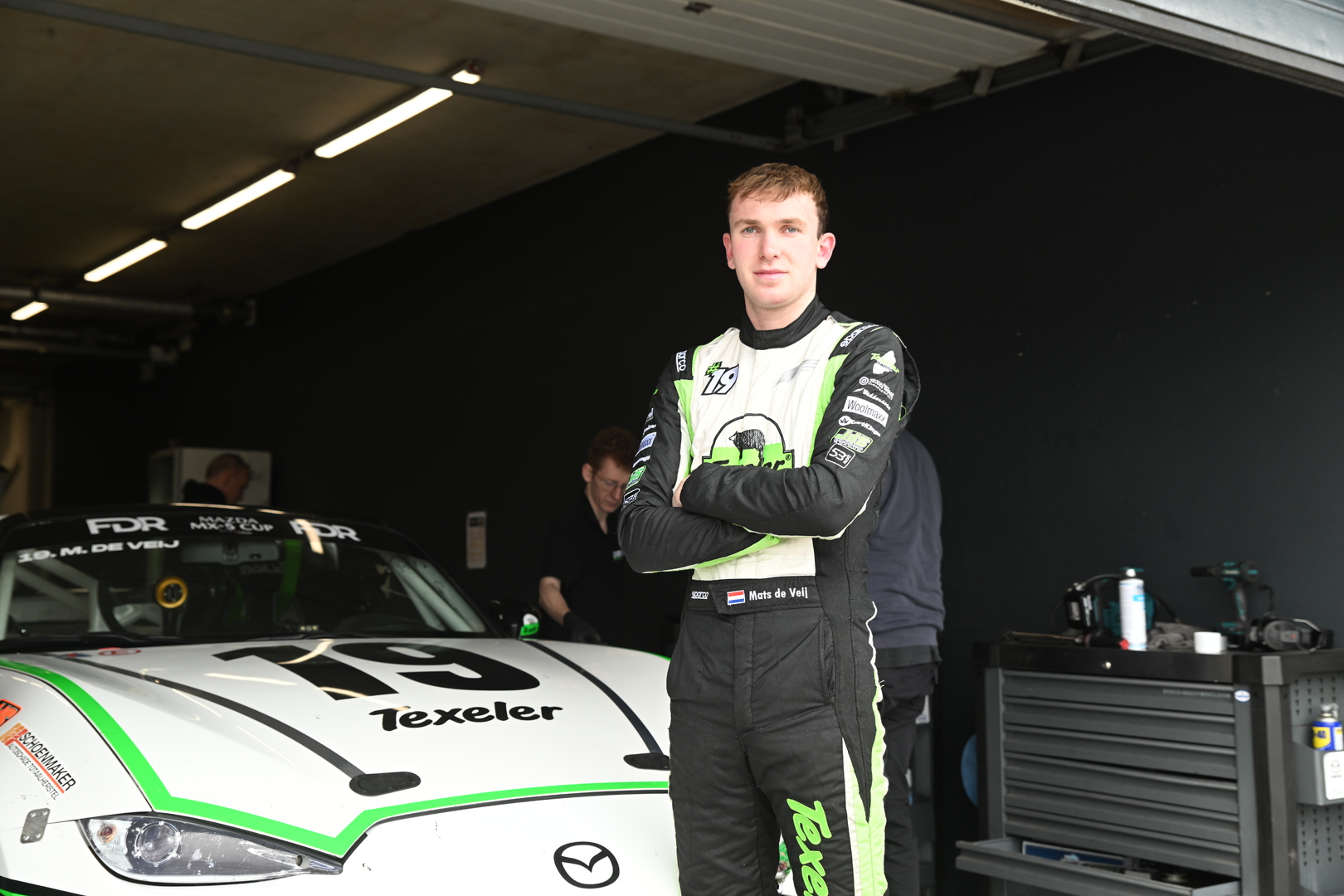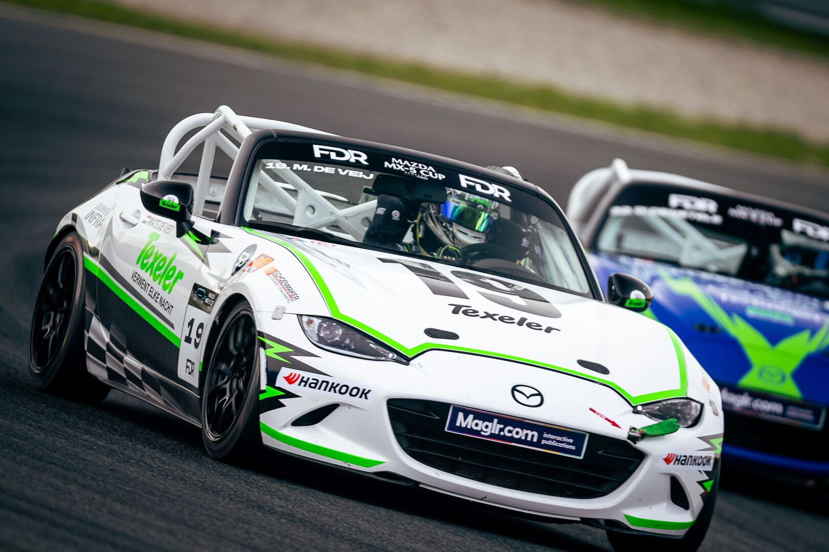 “In de DNRT-periode reed ik niet voor Dekker Racing, maar daar zijn natuurlijk wel de contacten met Marcel Dekker ontstaan, waardoor we ons nu bij zijn team hebben aangesloten. Mijn vader, een vriend van hem en ik onderhouden de auto zelf, en die gaat dus ook steeds mee naar huis, maar op de circuits sluiten we aan bij Dekker Racing. Ze hebben natuurlijk enorm veel ervaring, werken professioneel, maar daarnaast is het ook gewoon heel gezellig bij ze”, aldus De Veij, die één dag in de week naar Leeuwarden reist voor zijn studie bedrijfskunde en de andere dagen in het familiebedrijf Texeler werkt, waar ze van de veelgeprezen wol van Texelse schapen onder andere dekbedden en kussens maken. Het verklaart ook meteen de livery van de Mazda MX-5 met startnummer 19.